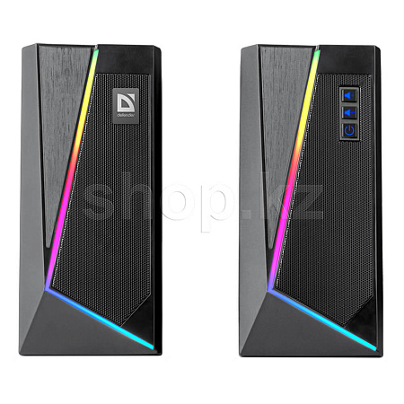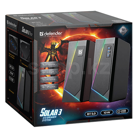 Акустическая система Defender Solar 3 (2.0) с функцией Bluetooth и отключаемой светодиодной подсветкой. Сенсорная поверхность для переключения режимов подсветки. Кнопки управления громкостью, переключения режимов AUX/Bluetooth и включения/отключения питания удобно расположены на фронтальной панели.