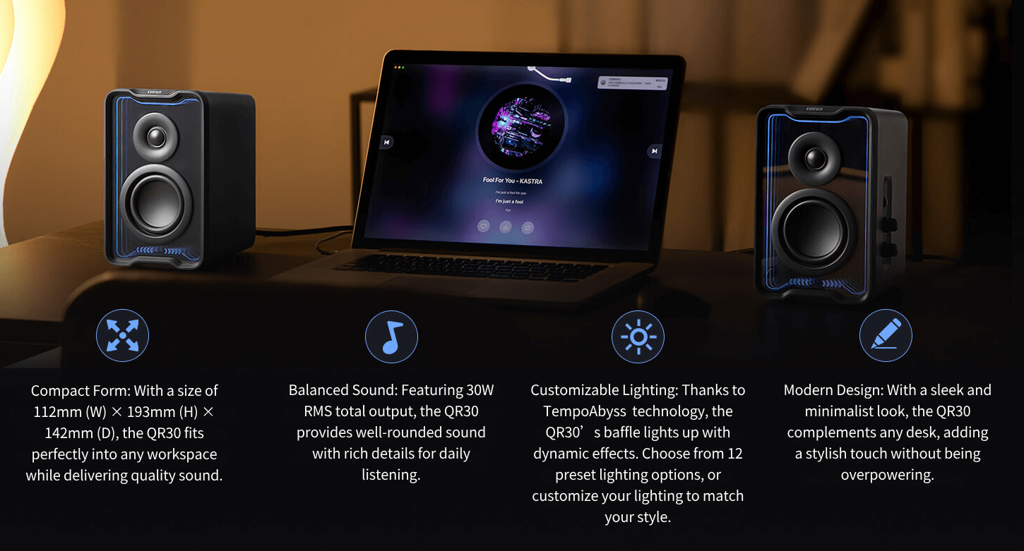 EDIFIER QR30 отличается компактным дизайном, насыщенным звуком и настраиваемой подсветкой, что делает его отличным дополнением к любому рабочему столу. Идеально подходит для прослушивания музыки, просмотра фильмов и игр, обеспечивая полноценное аудиовизуальное восприятие