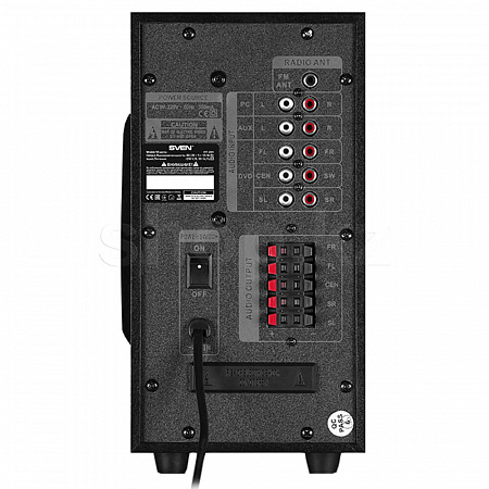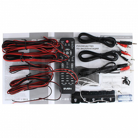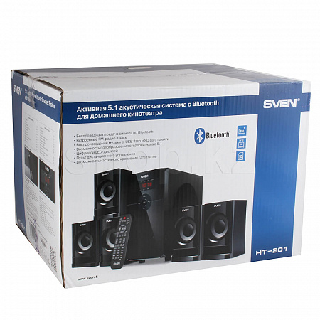 Эргономика модели продумана до мелочей. Цифровой LED-дисплей четко показывает время и режимы работы устройства. Управлять акустикой можно как с кнопок, расположенных на передней панели колонки, так и с удобного пульта дистанционного управления, поставляемого в комплекте. Sven HT-201 можно повесить на стену – для этого у сателлитов есть специальные крепления.