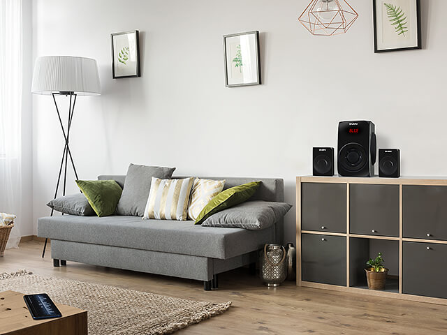 Беспроводная передача звука через Bluetooth обеспечит устойчивое подключение к гаджету на расстоянии до 10м. Быстро включить фоновую музыку, послушать подкаст или аудиокнигу больше не проблема — достаточно один раз «познакомить» смартфон с акустической системой, после чего весь процесс будет занимать считанные секунды.