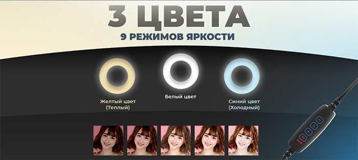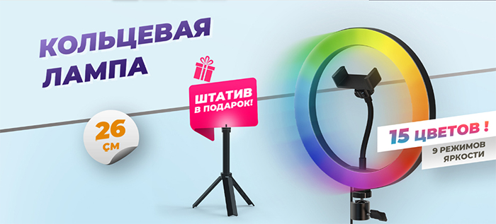 Кольцевая RGB лампа диаметром 26 см в комплекте с настольным штативом, с различными цветовыми режимами и регулировкой уровня яркости. Питание от USB-порта.