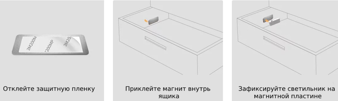 Отклейте защитную 3M пленку с магнитной пластины и наклейте ее на место, где вы собираетесь установить светильник. Инфракрасный датчик должен быть обращен вверх/наружу.