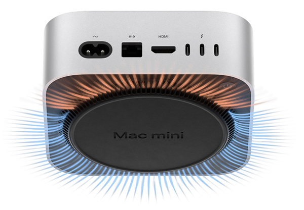 Для размещения такой большой мощности в таком маленьком пространстве потребовалась совершенно новая тепловая архитектура. В Mac mini воздух направляется на разные уровни системы, и весь он проходит через ножки. В сочетании с непревзойдённой энергоэффективностью кремния Apple это позволяет Mac mini работать с интенсивными нагрузками на запредельных скоростях. Он спокойный, холодный и совершенный.