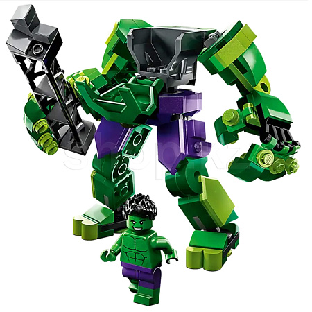 В набор входит минифигурка Халка и собираемый мех Халка с аксессуарами, включая "каменную" опору, за которую мех может держаться.