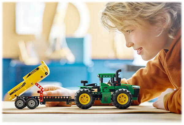 Детям, которые любят тракторы, понравится собирать свой собственный трактор John Deere. Они отлично проведут время, исследуя все детали модели. Прицеп трактора наклоняется, что делает его идеальным для перевозки тяжёлых грузов.