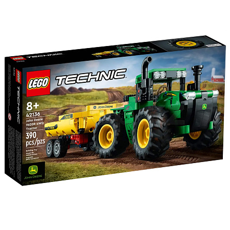 John Deere 9620R 4WD Tractor LEGO Technic (42136). Этот трактор с прицепом, разработанный в сотрудничестве с John Deere, отличается реалистичными функциями. У него огромные колёса, шарнирное рулевое управление и поворачивающееся кресло в кабине водителя.