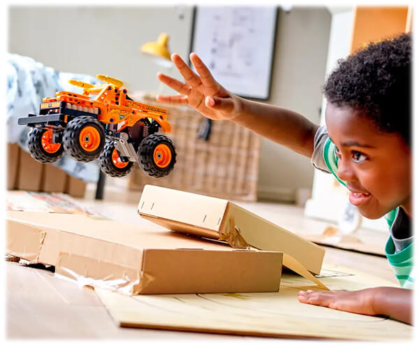 Дети развивают навыки в ходе сборки и получают массу удовольствия, используя инерционный механизм для постановки крутых трюков.
