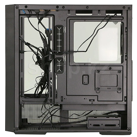 Корпус выполнен из прочной стали SPCC толщиной 0,5 мм в сочетании с пластиковыми элементами и боковой панелью из закалённого стекла. Прозрачная панель позволяет продемонстрировать внутреннюю сборку, а подсветка установленных вентиляторов придаёт системе стильный и современный внешний вид.