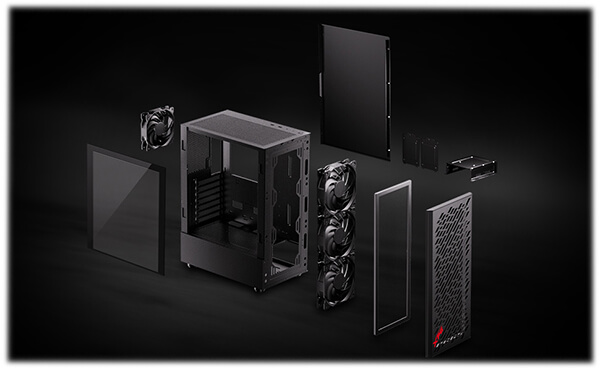 Аэродинамический дизайн передней панели с резьбой обеспечивает визуальную эстетику при модификации под ARGB-системы и усиливает воздушный поток, выводимый 4 входящими в комплект поставки 120-мм вентиляторами.