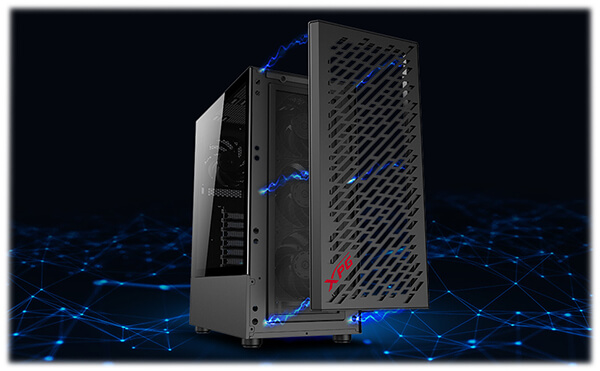 XPG VALOR AIR имеет элегантный и чистый внешний вид с аэродинамическим дизайном, который способствует поступлению холодного наружного воздуха через 3 предустановленных 120-мм вентилятора на передней панели и 120-мм вентилятор на задней панели для отвода тепла.