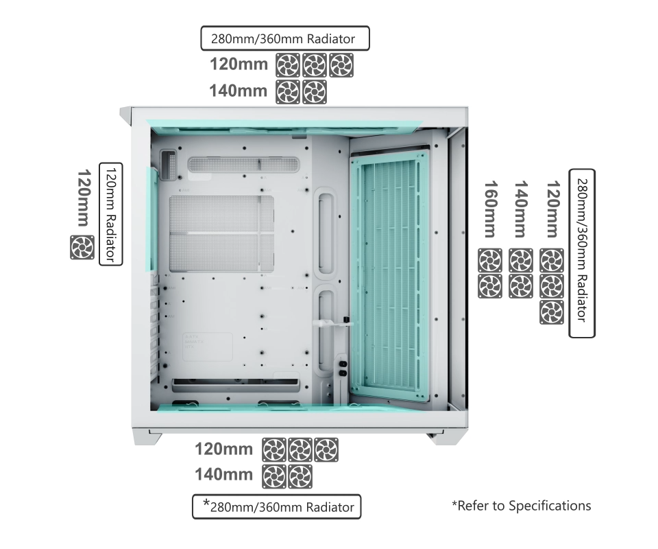 120 мм, 140 мм, 240 мм, 280 мм, 360 мм на боковой панели 120 мм, 140 мм, 240 мм, 280 мм, 360 мм на верхней панели 120 мм, 140 мм, 240 мм, 280 мм, 360 мм на нижней панели (радиатор 140/280: когда материнская плата находится в верхнем положении, не рекомендуется устанавливать жидкостное охлаждение внизу) 120 мм на задней панели