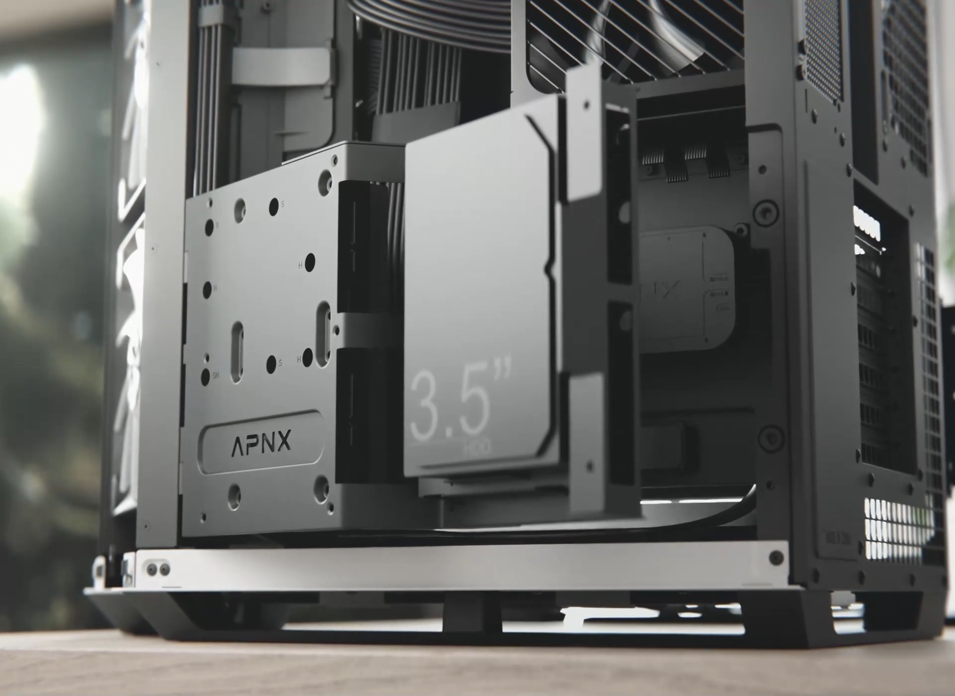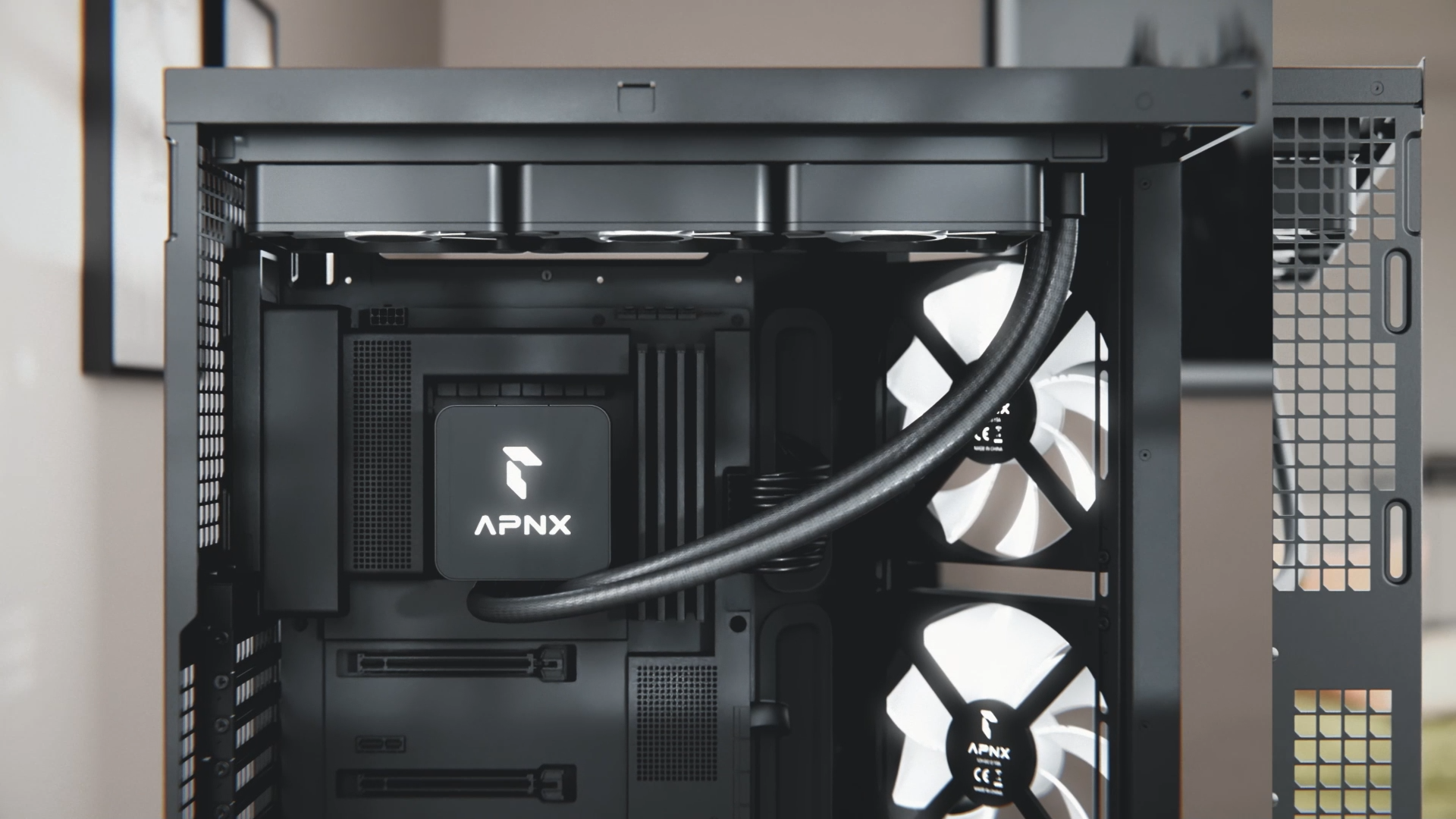 Корпус APNX V1 формата Mid-Tower сочетает в себе настраиваемую точность охлаждения и уникальную конструкцию с 45-градусным воздухозаборником, заключенную в элегантную панорамную двухкамерную конструкцию.