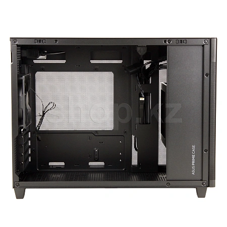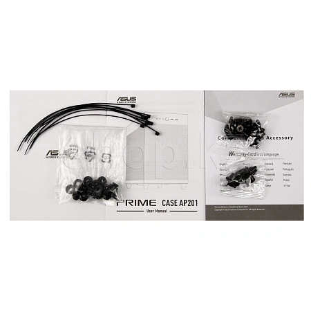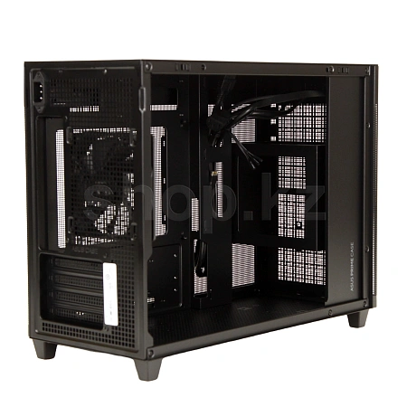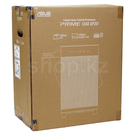 Корпус ASUS PRIME AP201: стильный дизайн, форм-фактор MICROATX, объем 33 л, боковые панели с безвинтовым креплением и сетчатой структурой, поддержка СВО с радиаторами 360 мм, видеокарт длиной до 338 мм и стандартных блоков питания ATX.