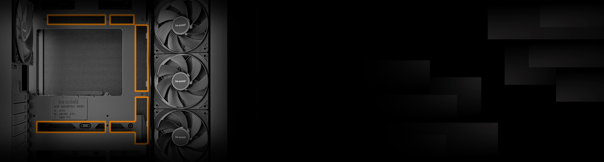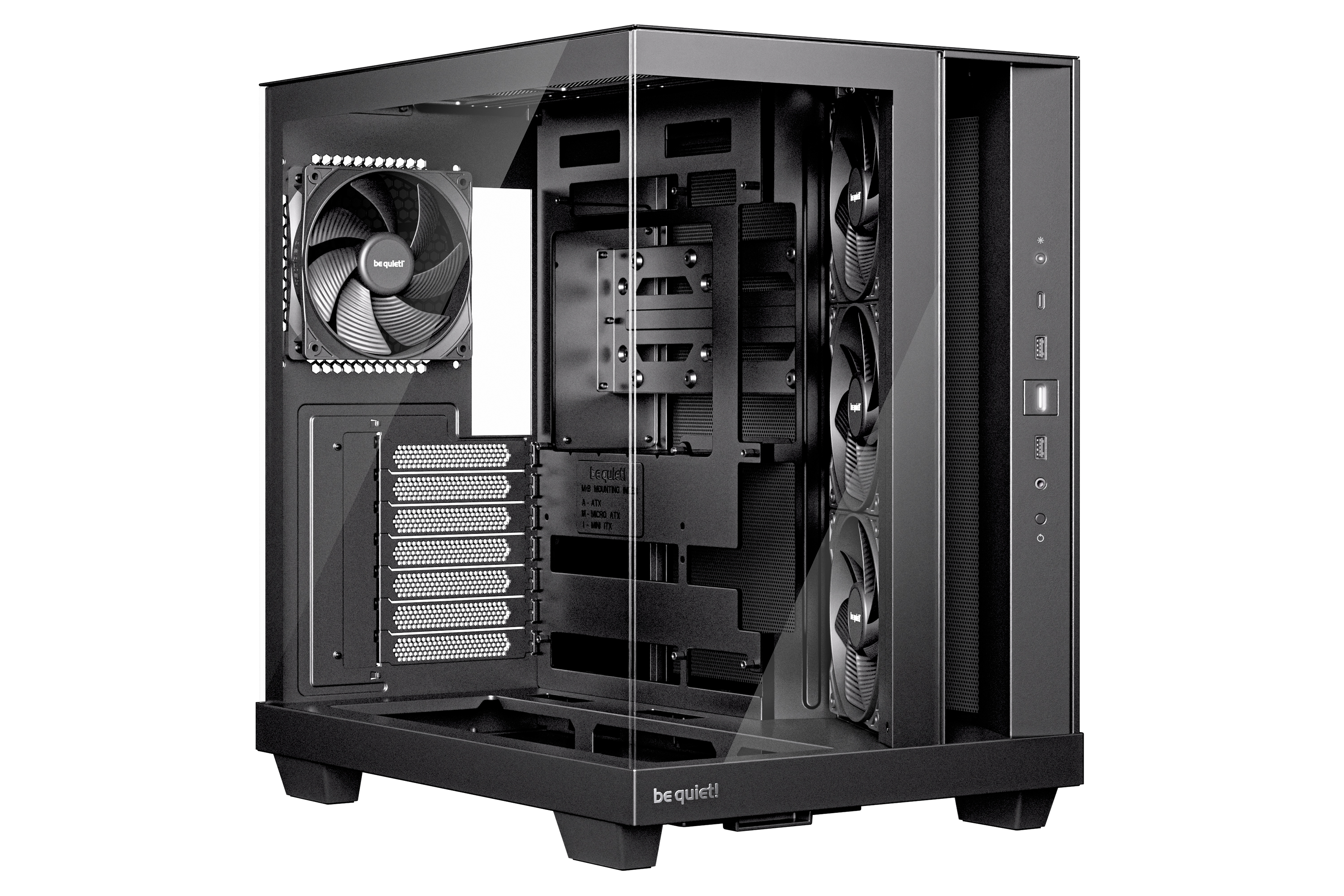 Light Base 500 сразу из коробки оснащен 4 вентиляторами Pure Wings 3: один Pure Wings 3 120mm PWM в тыльной части и три 120mm PWM-вентиляторы с реверсивными лопастями на боковой части. Вентиляторы оптимизированы для максимального потока воздуха и низкого уровня шума благодаря специальной форме лопастей, которая предотвращает образование турбулентности потока. Реверсивные лопасти обеспечивают привлекательный внешний вид вентиляторов из фронтальной стороны.