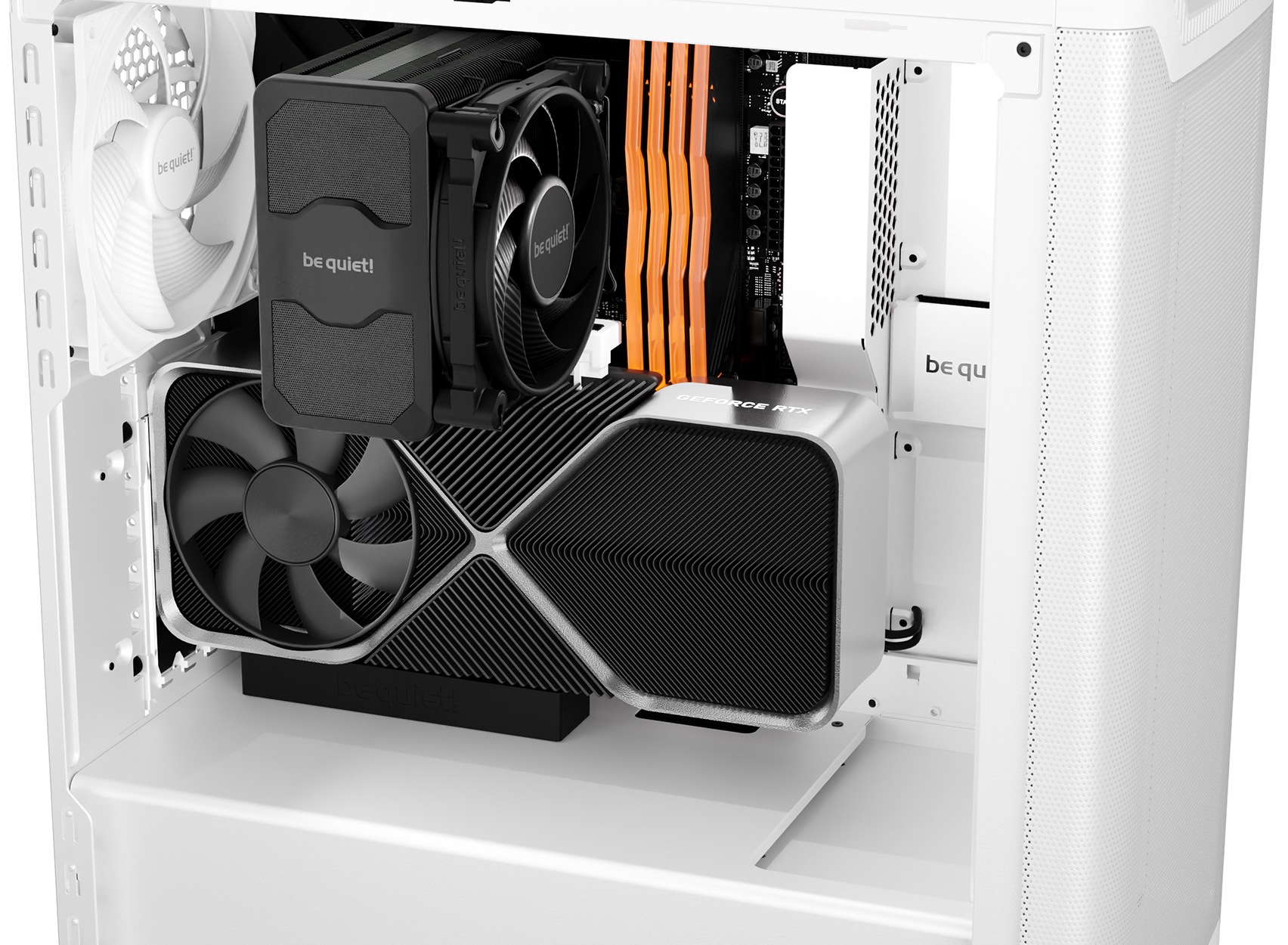 Расстояние между ними идеально подходит для опционального кабеля be quiet! Riser Cable, пенопластовая основа которого обеспечивает отличную поддержку от провисания для видеокарт в вертикальном положении.