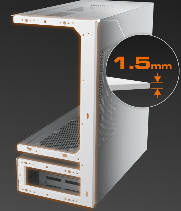 Стальной каркас толщиной 1,5 мм усиливает шасси, сохраняя структурную целостность даже при подвесной центральной системе вентиляции. В результате получается смелая, открытая архитектура, которая остается жесткой, надежной и готовой к использованию в высокопроизводительных системах.