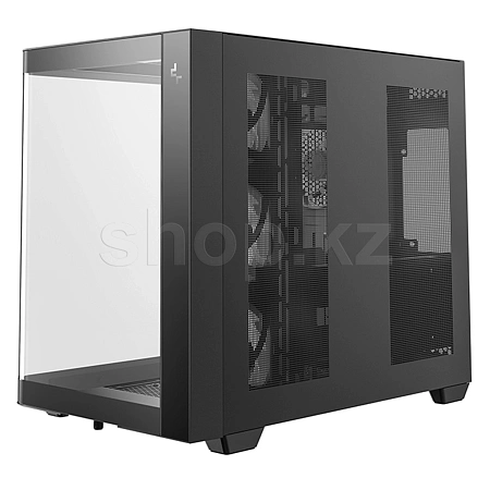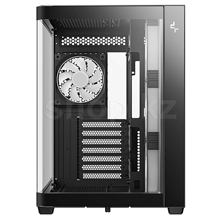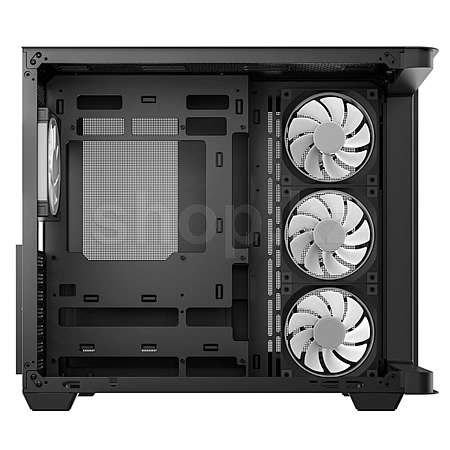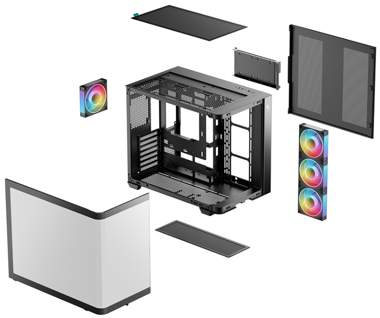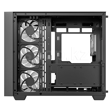 Корпус поставляется с четырьмя вентиляторами ARGB: три вентилятора с обратными лопастями установлены на боковой панели и один стандартный вентилятор — на задней панели. Конфигурация со сбалансированным вводом и выводом воздуха обеспечивает интенсивный воздушный поток и эффективное охлаждение без дополнительной настройки.