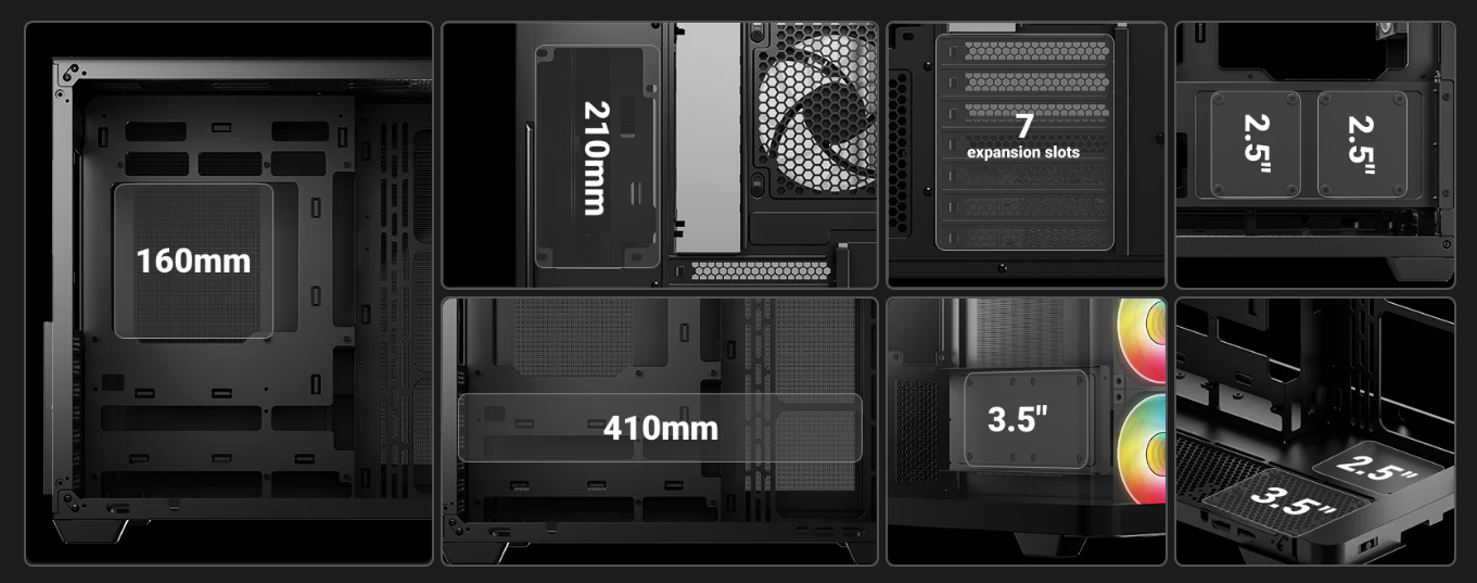 Благодаря встроенной поддержке требовательного аппаратного обеспечения в корпус CG530U 4F можно устанавливать процессорные кулеры высотой до 160 мм, видеокарты длиной до 410 мм и блоки питания длиной до 210 мм, что открывает простор для создания высокопроизводительных сборок.