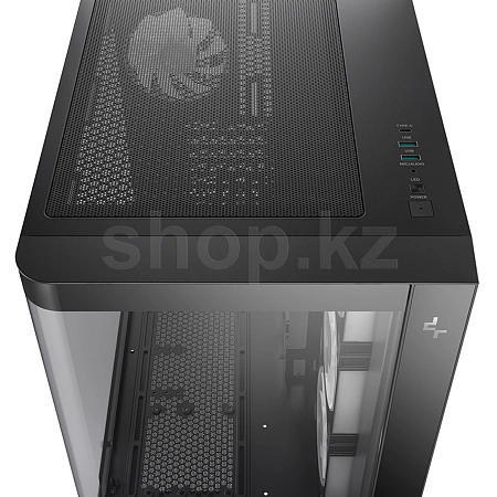Компоновка с двумя камерами изолирует блок питания и накопители от основного воздушного потока. Большие сетчатые панели улучшают вентиляцию, входные реверсивные вентиляторы на боковой панели забирают свежий воздух, а задний вентилятор выводит тепло, за счет чего в корпусе образуется горизонтальный воздушный поток.