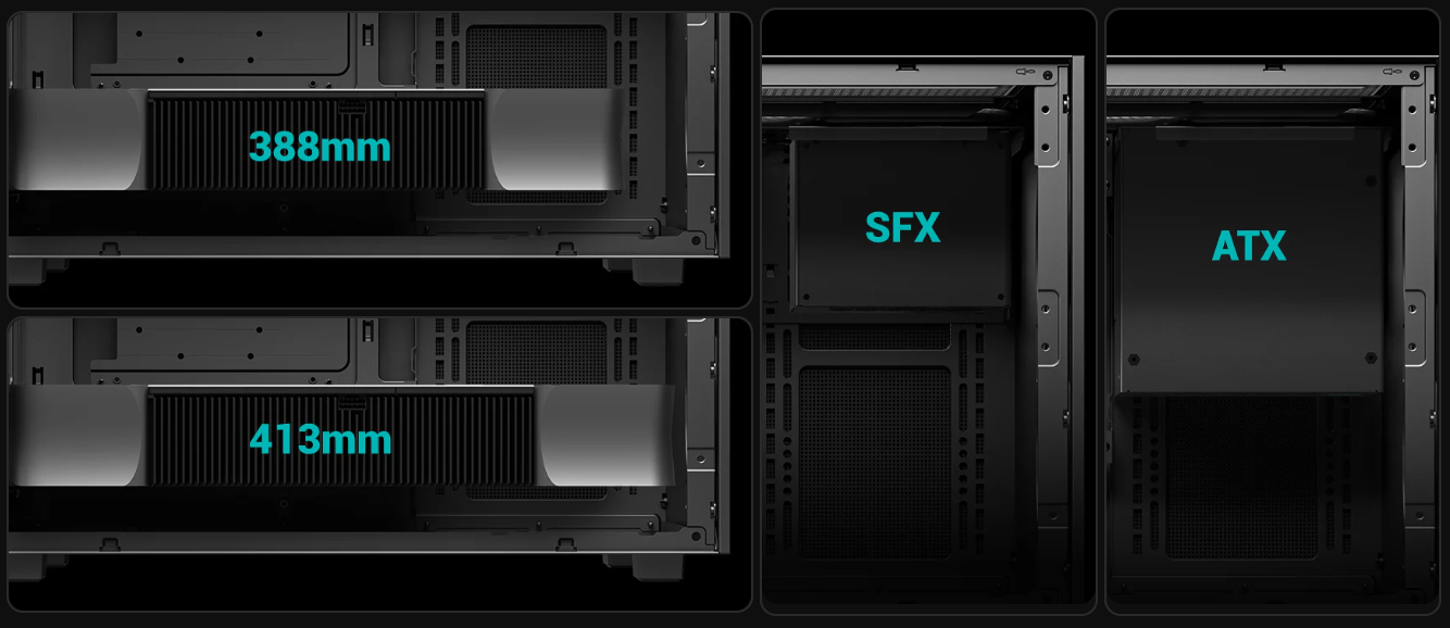 Корпус CH260 отличается широкой поддержкой ключевых компонентов и вмещает полноразмерные видеокарты длиной до 388 мм — или даже до 413 мм, если не устанавливать вентилятор в верхней части. Также в этот корпус можно установить блок питания ATX PS2 благодаря съемному кронштейну, который освобождает место для удобной прокладки кабелей.