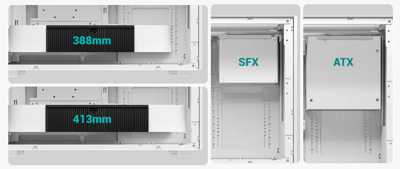 CH260 WH корпусы негізгі компоненттердің кең қолдауымен ерекшеленеді және ұзындығы 388 мм — ге дейін немесе тіпті 413 мм-ге дейін толық өлшемді графикалық карталарды орналастырады, егер желдеткіш жоғарғы жағына орнатылмаса. Сондай-ақ, бұл корпусқа ATX PS2 қуат көзін орнатуға болады, ол кабельдерді оңай бағыттауға мүмкіндік беретін алынбалы кронштейннің арқасында.