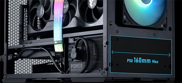 Блок питания стратегически расположен на передней панели, а порты разъемов направлены наружу для удобного подключения кабелей. Кроме того, для доступа к питанию сзади предусмотрен удлинительный кабель адаптера питания БП.