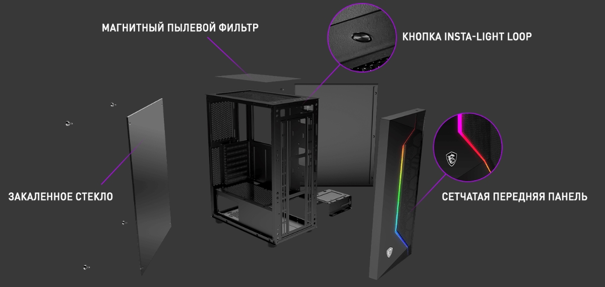 Данный корпус отличается усиленной вентиляцией за счет того, что передняя панель сделана сетчатой и свободно пропускает воздух внутрь. Помимо практичности такая конструкция еще и отлично выглядит!