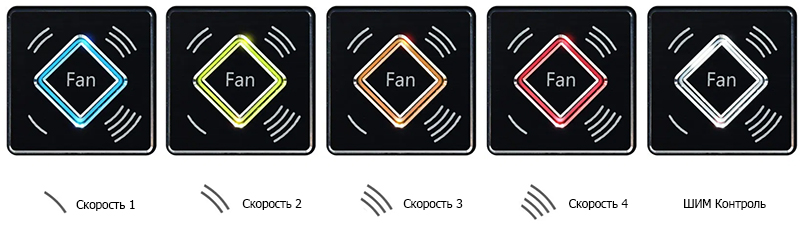 Каждый режим работы вентилятора подсвечивается разным цветом.