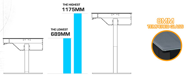 Корпус из алюминиевого сплава и 8 мм закаленное стекло столешницы выдерживают нагрузку до 80 кг. Высота стола регулируется с помощью встроенного мотора в пределах от 689 мм до 1175 мм. Есть возможность сохранить в памяти 4 положения стола по высоте, чтобы быстро и удобно изменить настройки для работы сидя или стоя.