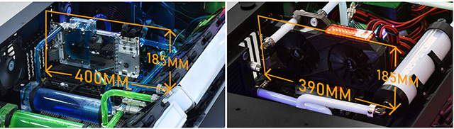 Можно установить мощные видеокарты длиной до 390 мм в систему и башенные кулеры для CPU высотой до 185 мм. Также доступна установка большого числа дисковых накопителей, до 9 х 3.5" HDD или 6 х 3.5" HDD + 3 x 2.5" SSD.