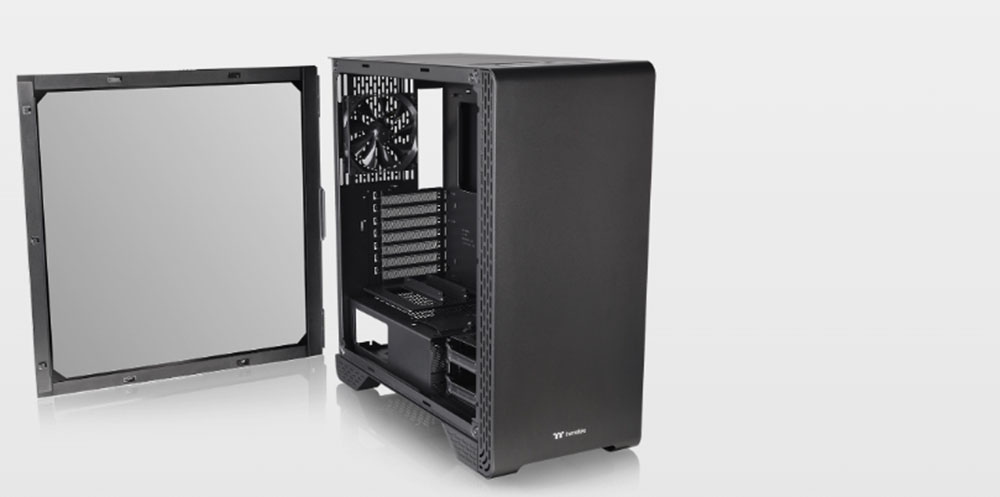 Полностью металлическое шасси с боковой панелью из закаленного стекла и сглаженной передней панелью.
