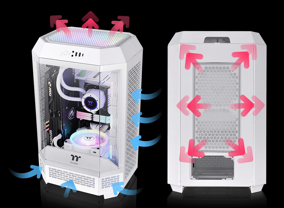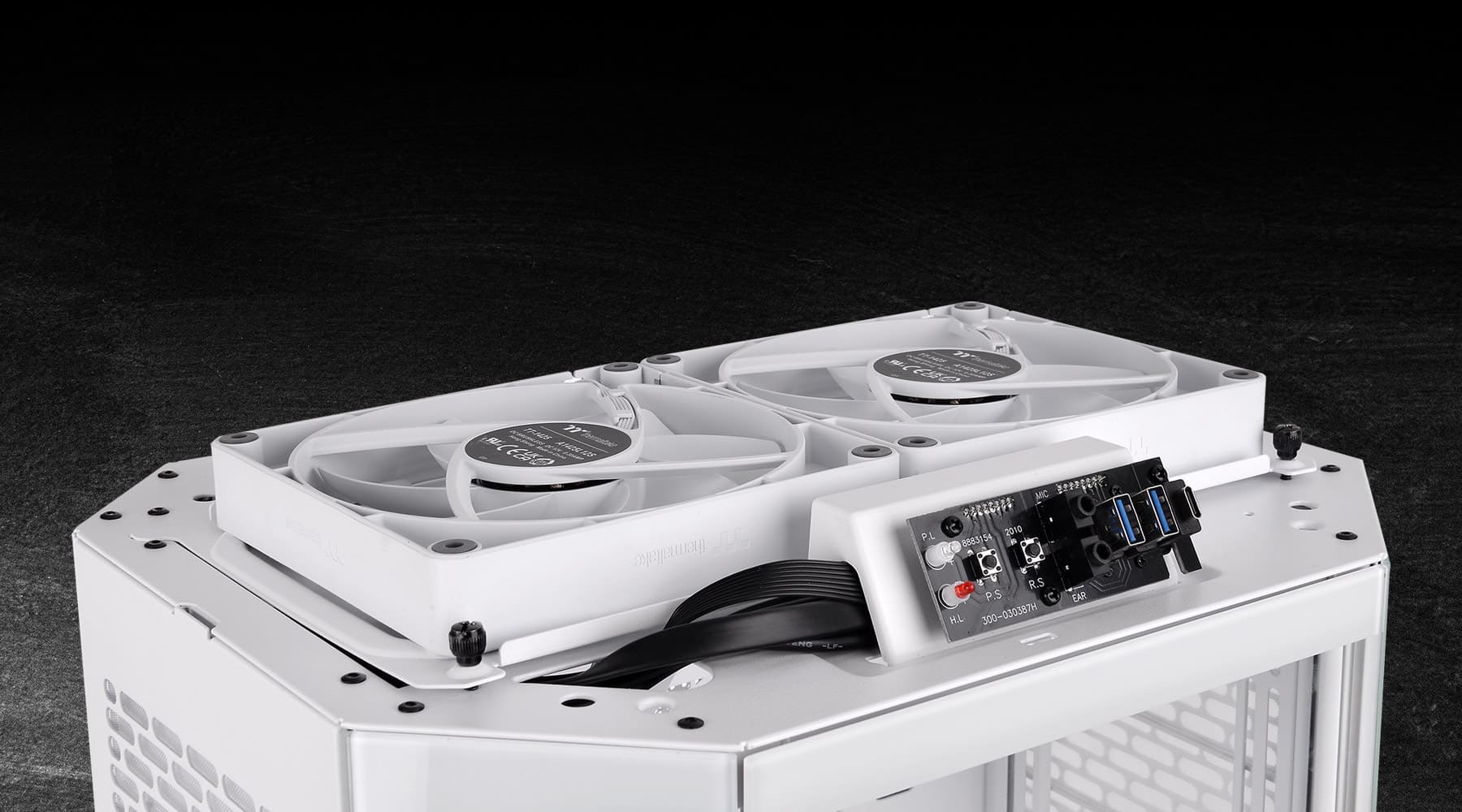 Корпус The Tower 300 Snow комплектуется двумя 140-мм вентиляторами с ШИМ управлением оборотов на верхней панели, обеспечивая эффективное охлаждение.
