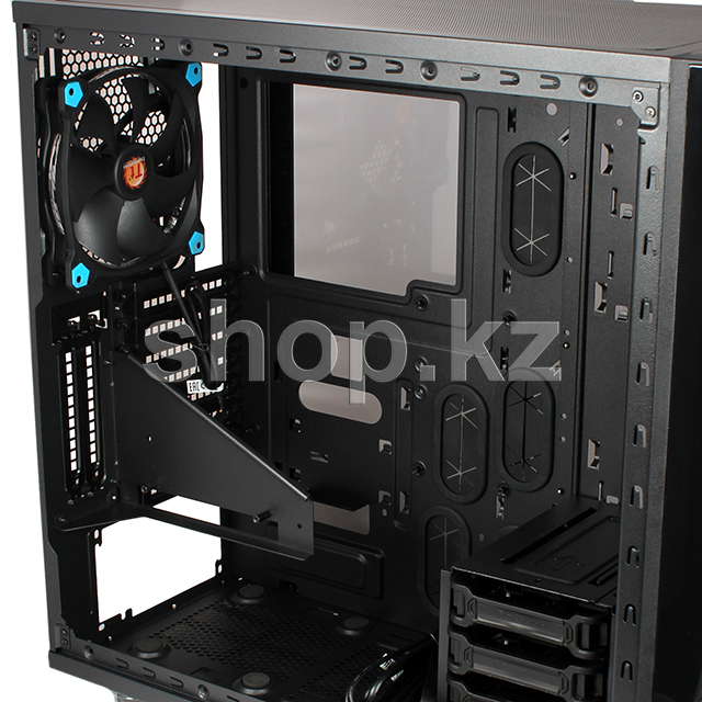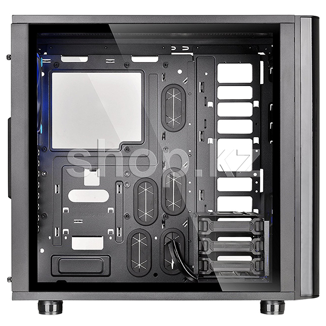 Корпус View 31 TG имеет две прочные боковые панели из закаленного стекла, кронштейн для крепления видеокарты в вертикальной плоскости и 2 предустановленных охлаждающих вентилятора 140mm Riing Blue с пылевыми фильтрами. View 31 TG имеет продуманную систему вентиляции и идеально подходит для установки самого современного компьютерного "железа" класса high-end с использованием жидкостных систем охлаждения.