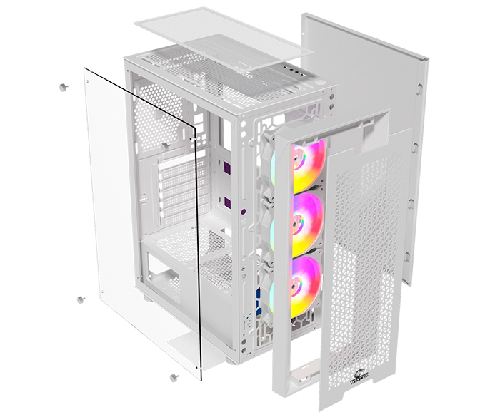Wintek Andromeda PRO E306M-W TG - корпус формата Mid Tower, с боковой крышкой из закаленного стекла, для демонстрации компонентов, съемной передней панелью и тремя RGB вентиляторами, установленными на передней и задней панелях.