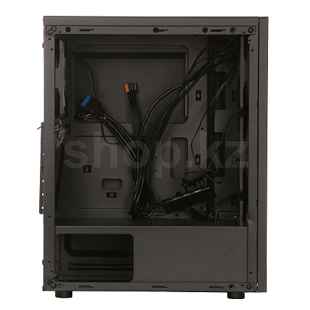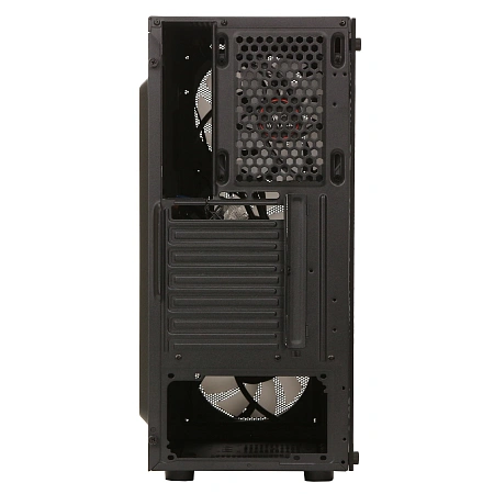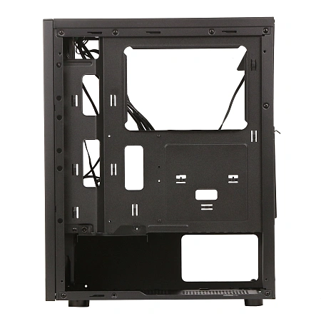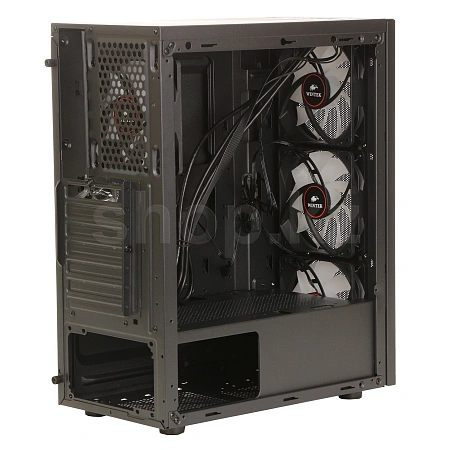 Боковая панель корпуса выполнена из закалённого стекла, что позволяет демонстрировать внутренние компоненты и подсветку вентиляторов. Черная цветовая гамма корпуса и RGB-подсветка создают стильный и современный внешний вид, который идеально впишется в любую игровую или рабочую станцию.