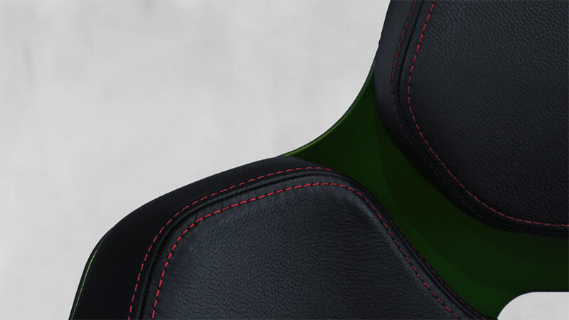Вся зона сидения и подголовника полностью покрыта натуральной кожей толщиной от 1 до 1.1 мм. Натуральная кожа проста в уходе и славится своей долговечностью и влагостойкостью. Красная элегантная строчка дополняет непревзойденный дизайн и прекрасно вписывается в общий концепт.
