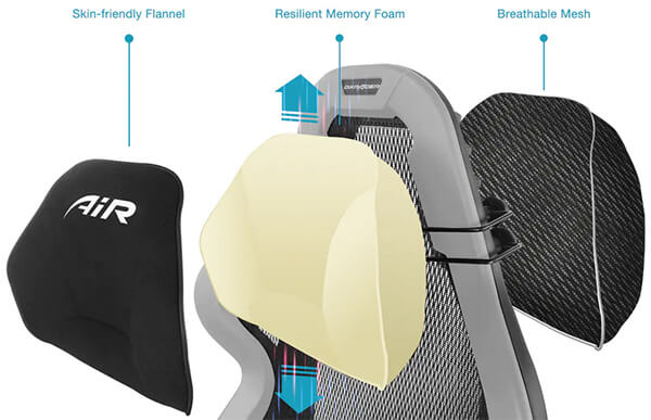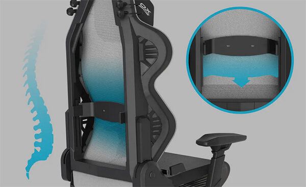 Поясничная опора на рельсах, прикрепленная к жесткому стальному каркасу, плавно регулируется по высоте независимо от спинки сиденья, обеспечивая дополнительный уровень комфорта.