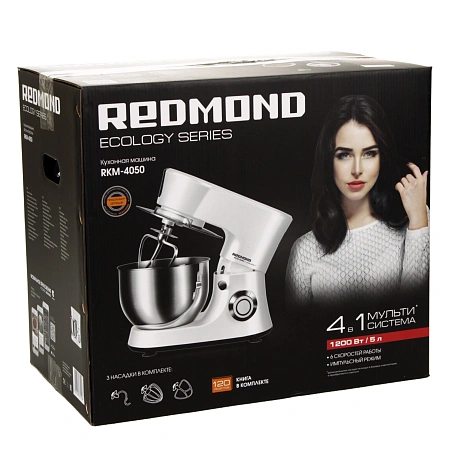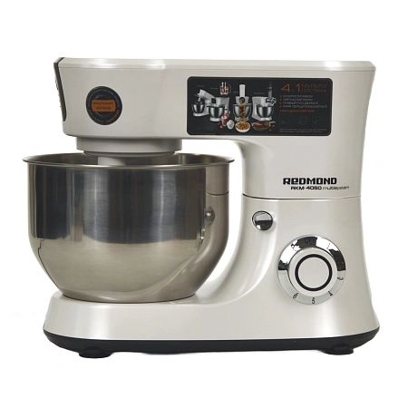 Кухонная машина REDMOND RKM-4050 – многофункциональный прибор «4 в 1» для быстрого измельчения продуктов, шинковки овощей, приготовления фарша, взбивания воздушных кремов и пенок, а также для замешивания теста. Широкий набор комплектных и дополнительных насадок позволяет использовать прибор как планетарный миксер, овощерезку, мясорубку и стационарный блендер