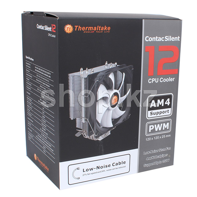 Thermaltake Contac Silent 12 это бюджетный кулер для центрального процессора с отличной производительностью. Он имеет 120мм вентилятор с ШИМ управлением оборотов, что позволяет материнской плате задавать скорость вращения лопастей в зависимости от температуры на процессоре.