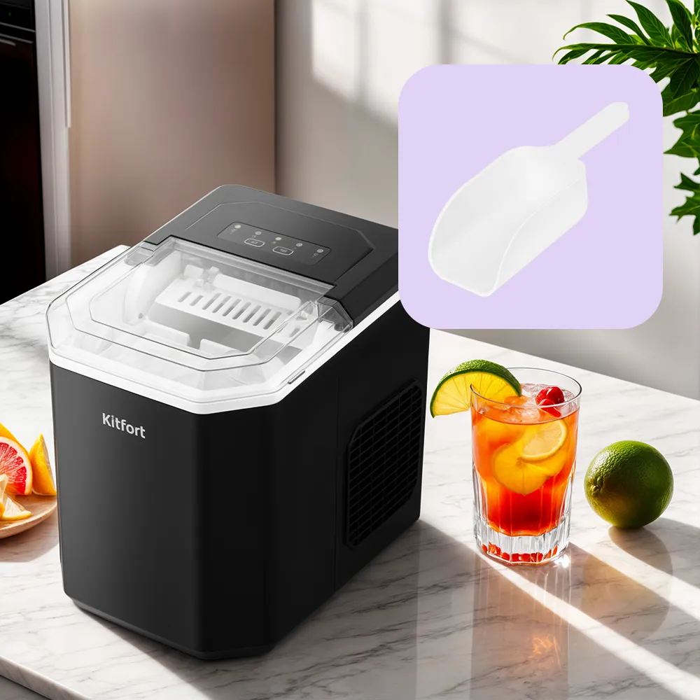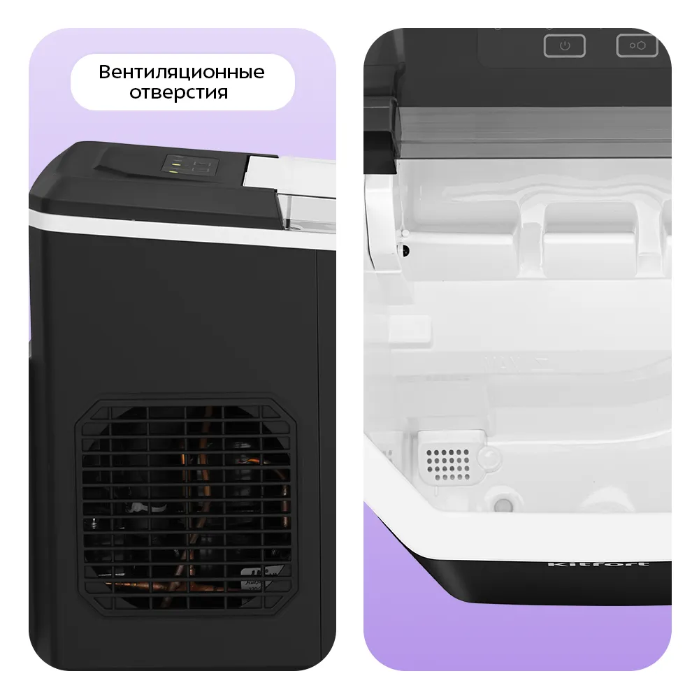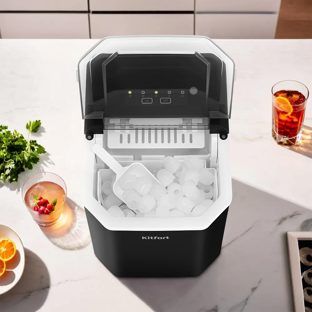 В устройстве предусмотрена функция автоматической очистки, это позволит легко ухаживать за прибором. У льдогенератора есть прозрачная крышка для наблюдения за процессом. Корзина для льда съёмная.