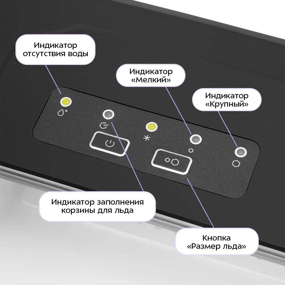 Кнопка «Размер льда» позволяет выбрать размер льда. Индикатор заполнения корзины для льда загорается, когда корзина полностью заполнилась. Когда в резервуаре для воды заканчивается вода, загорается индикатор отсутствия воды, генерация льда прекращается.