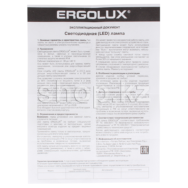 Ergolux LED-A60-10W-E27-3K, 10Вт, 3000K LED шамы