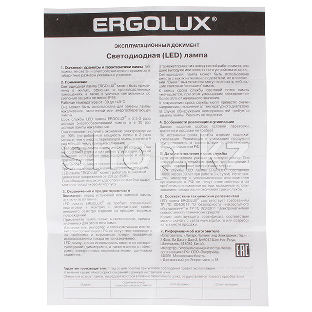 Светодиодная лампа Ergolux может быть применена в жилых, офисных и производственных помещениях, а также в уличных светильниках со степенью защиты не менее IP54. Срок службы LED лампы в 2.5 - 3 раза дольше энергосберегающей лампы и в 30 раз дольше лампы накаливания.