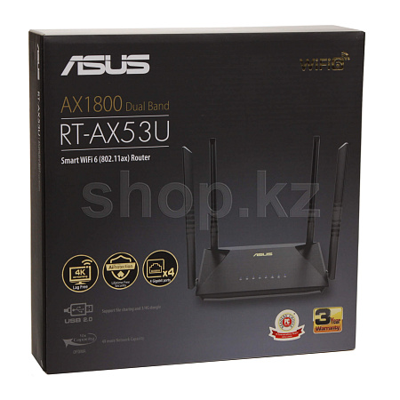 RT-AX53U – это двухдиапазонный беспроводной маршрутизатор с антенной конфигурацией 2х2. Используя широкие каналы связи (80 МГц) и квадратурную модуляцию 1024-QAM, он способен обеспечить общую скорость передачи данных по сети Wi-Fi на примерном уровне в 1800 Мбит/с: 574 Мбит/с в диапазоне 2.4 ГГц и 1201 Мбит/с в диапазоне 5 ГГц. Таким образом, данная модель в 1.5 раза быстрее, чем двухдиапазонные маршрутизаторы стандарта 802.11ac с аналогичной антенной конфигурацией.
