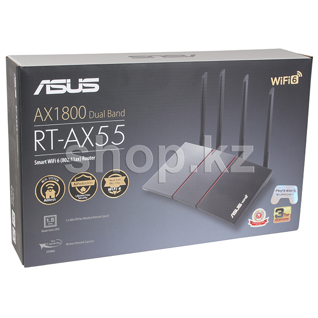RT-AX55 – это двухдиапазонный беспроводной маршрутизатор с антенной конфигурацией 2х2. Используя широкие каналы связи (80 МГц) и квадратурную модуляцию 1024-QAM, он способен обеспечить общую скорость передачи данных по сети Wi-Fi на уровне около 1800 Мбит/с: 574 Мбит/с в диапазоне 2.4 ГГц и 1201 Мбит/с в диапазоне 5 ГГц. Таким образом, данная модель в 1.5 раза быстрее, чем двухдиапазонные маршрутизаторы стандарта 802.11ac с аналогичной антенной конфигурацией.