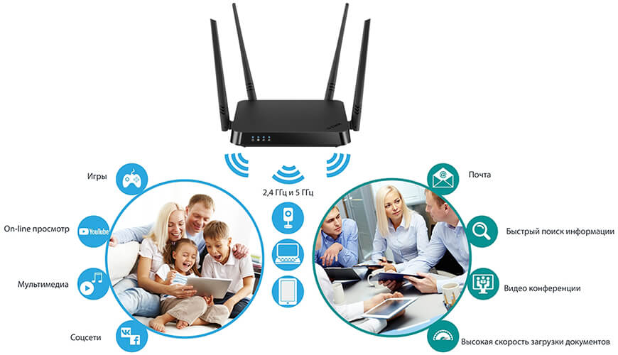 Одновременная работа в диапазонах 2.4 ГГц и 5 ГГц позволяет использовать беспроводную сеть для широкого круга задач. Маршрутизатор может выполнять функции базовой станции для подключения к беспроводной сети устройств, работающих по стандартам 802.11a, 802.11b, 802.11g, 802.11n и 802.11ac (со скоростью беспроводного соединения до 1167 Мбит/с).