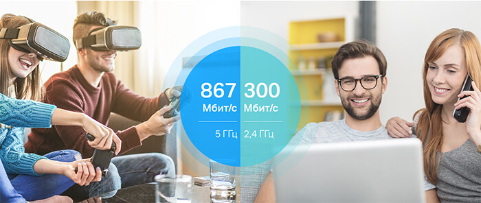 Archer A6 позволит создать надёжную и быструю Wi-Fi сеть стандарта 802.11ac. Используйте диапазон 2.4 ГГц со скоростью до 300 Мбит/с для выполнения повседневных задач, таких как работа с почтой и просмотр веб-страниц, а диапазон 5 ГГц со скоростью до 867 Мбит/с — для просмотра HD-стримов и онлайн-игр.