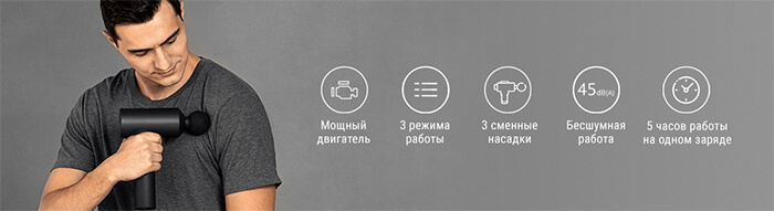 Массажный пистолет имеет три режима работы: 1800, 2400 и 3200 колебаний в минуту. Самый «мягкий» режим подходит для расслабления, а максимальный предназначен для снятия болей после интенсивных тренировок.