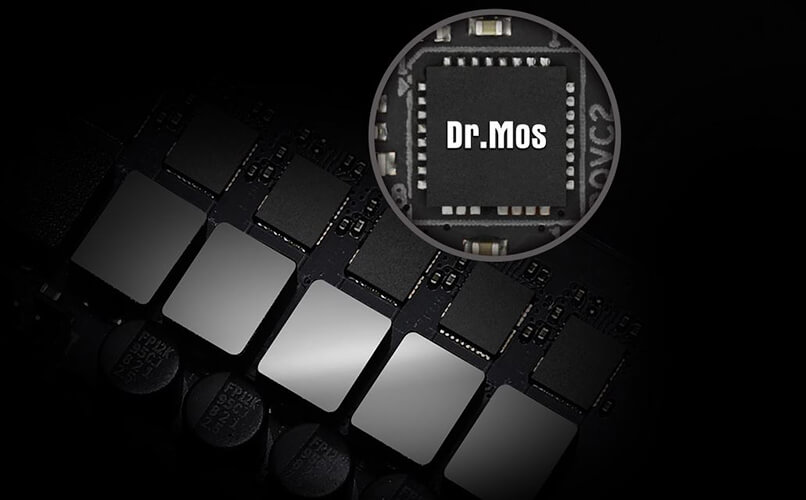 Dr.MOS – это интегрированная система питания, оптимизированная под синхронную подачу вольтажа для ресурсоёмких приложений! В сравнении с обычными дискретными транзисторами, Dr.MOS рассчитано подаёт высокий ток по каждой фазе, улучшая термальный результат и обеспечивая наивысшую производительность.