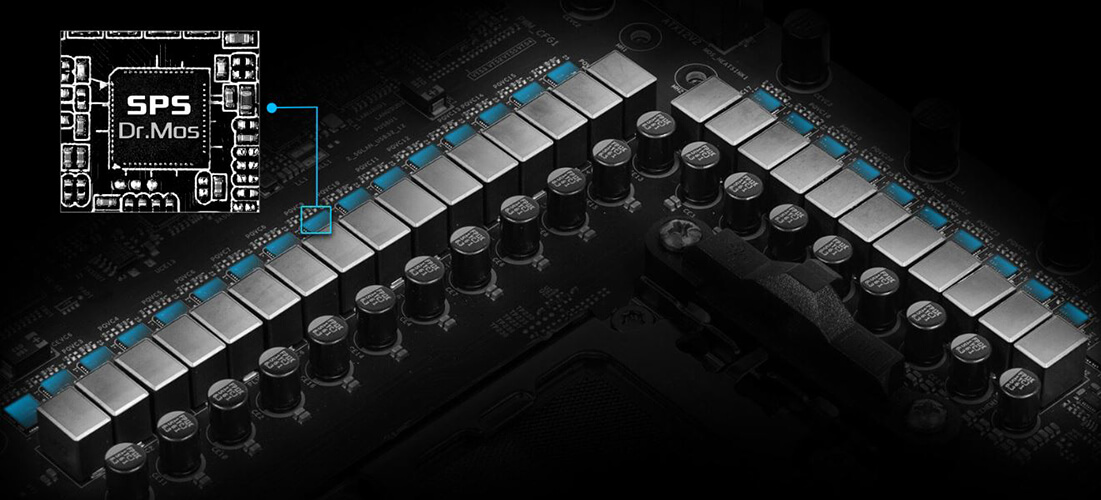 Дизайн Dr.MOS включает в себя новейшую технологию SPS (Smart Power Stage). За счёт постоянного контроля тока и температуры по каждой фазе обеспечивается плавное и равномерное питание процессора, при улучшенной производительности и расширенных возможностях разгона.